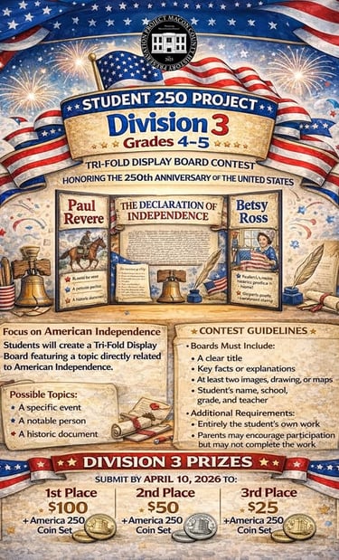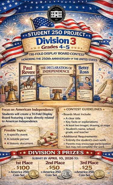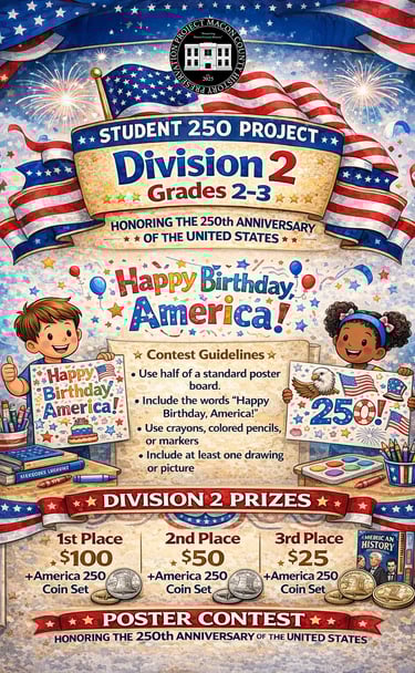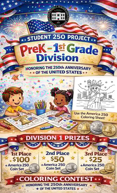 Designed to engage students at every grade level, this project invites young learners to explore American history, civic values, and national heritage through creative and academic challenges tailored to their age group. From coloring contests for early elementary students to history fairs and essay competitions for older students, the program encourages critical thinking, creativity, and a deeper connection to our shared past.