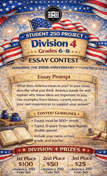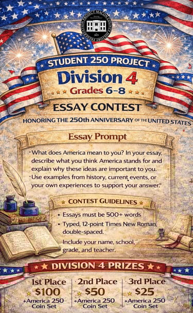 Entries will be evaluated by college and university professors, bringing a professional academic perspective to the judging process. Winners will receive cash prizes and commemorative America 250 coin sets, recognizing both achievement and participation in this historic milestone.