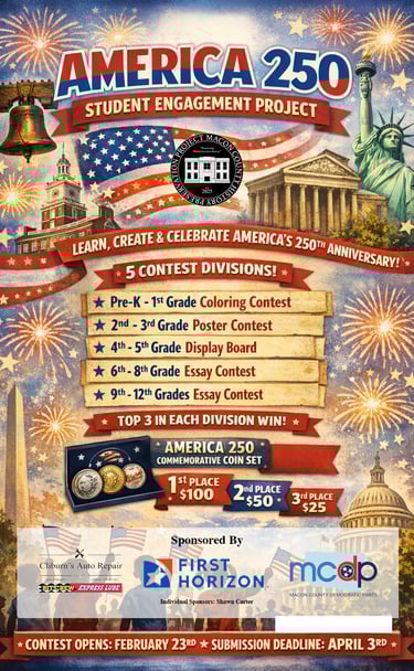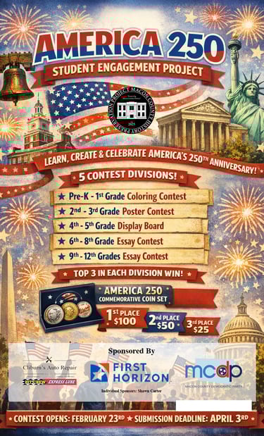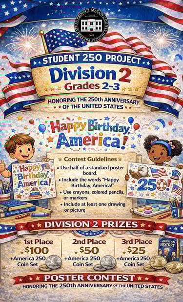 Launching in February and concluding in early April, the America 250 Student Engagement Project is more than a contest—it is an investment in education, civic pride, and the future of Macon County. By connecting students with history in meaningful ways, this initiative ensures that America’s 250th anniversary is remembered not only as a celebration of the past, but as an inspiration for the generations to come.