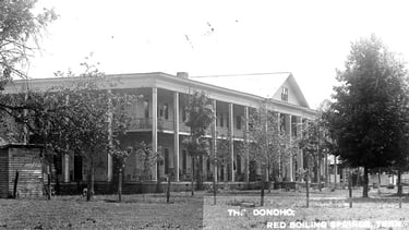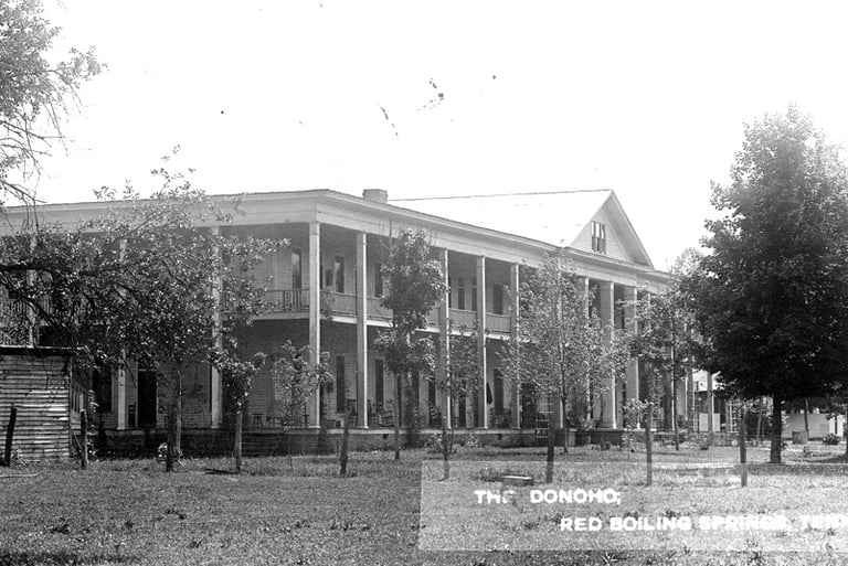 In its heyday, Red Boiling Springs hosted thousands of summer visitors — one summer the tiny town of ~800 had over 14,000 visitors. Notable guests registered at the Donoho including governors and congressmen. The resort setting offered much more than just springs: bowling alleys, swimming, dancing, scenic verandas, and carriage rides. There were several hotels in Red Boiling Springs during this time. Now, only 3 remained: the Donoho, the Armour, and the Thomas House.