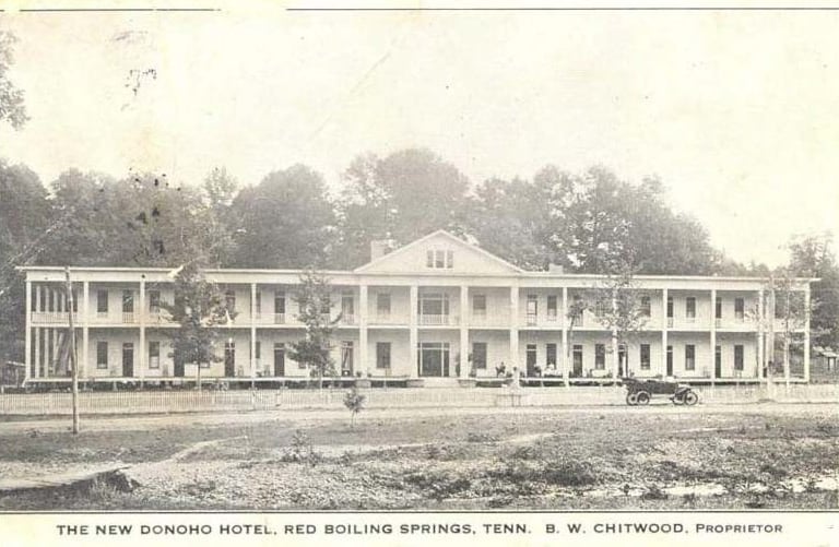 The story begins in the resort town of Red Boiling Springs, Tennessee — a place where, by the mid-19th century, natural mineral springs drew visitors seeking health, rest and recreation. On the site where the Donoho stood, the first hotel was built by Squire Donoho around 1901. That early building burned on August 27, 1915 (see photo of news article below). Many sources also state the original structure stood through 1913 and the new building was erected in 1914, however, newspaper articles about the loss of the first hotel do not line up with those dates.